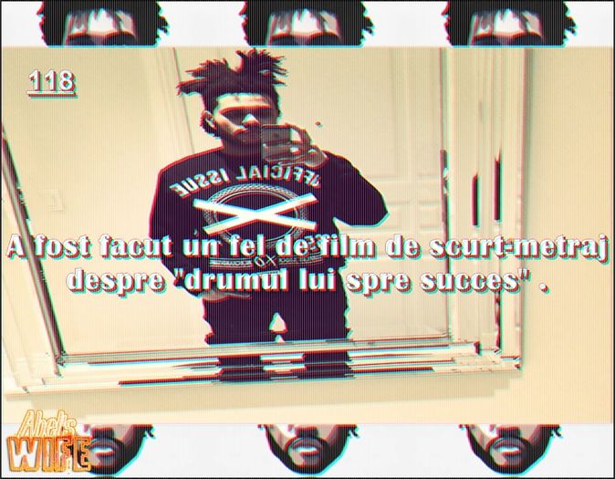 Wow...Am citit câteva din ele,dar le voi citit pe toate.Deoarece sunt foarte interesante.Abel e un om minunat,îl ador,pur şi simplu.A trăit fără tată,săracul..Cred că a fost foarte greu pentru el.Mă bucur să aflu de unde vine numle 'The Weeknd',foarte tare!Sunt super geniale toate,le voi citit în continuare pe toate.Felicitări pentru munca depusă pentru poze,edit,scrisul pe poze.Respect!